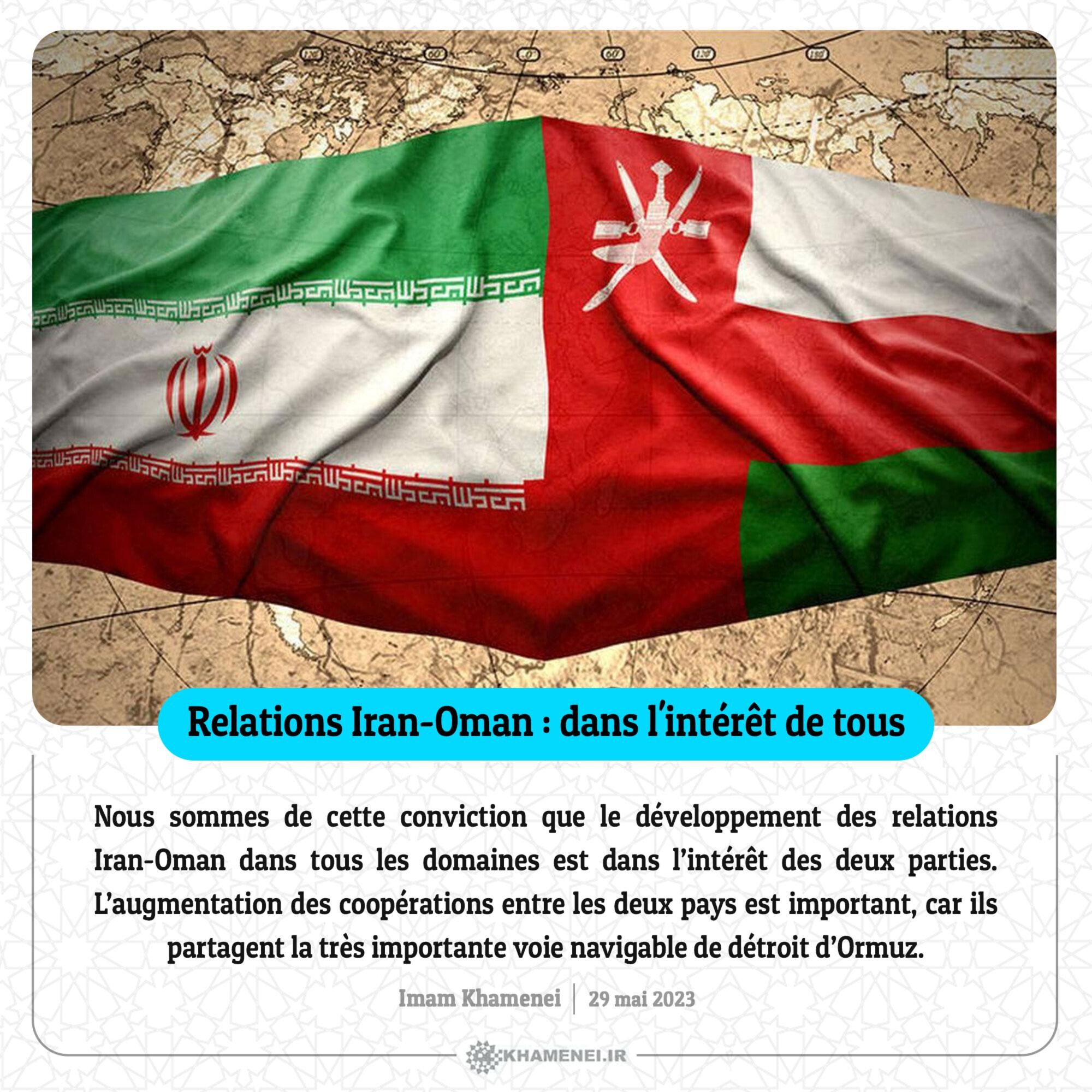 Nous sommes de cette conviction que le développement des relations Iran-Oman dans tous les domaines est dans l’intérêt des deux parties. L’augmentation des coopérations entre les deux pays est important, car ils partagent la très importante voie navigable de détroit d’Ormuz. Imam Khamenei, 29 mai 2023