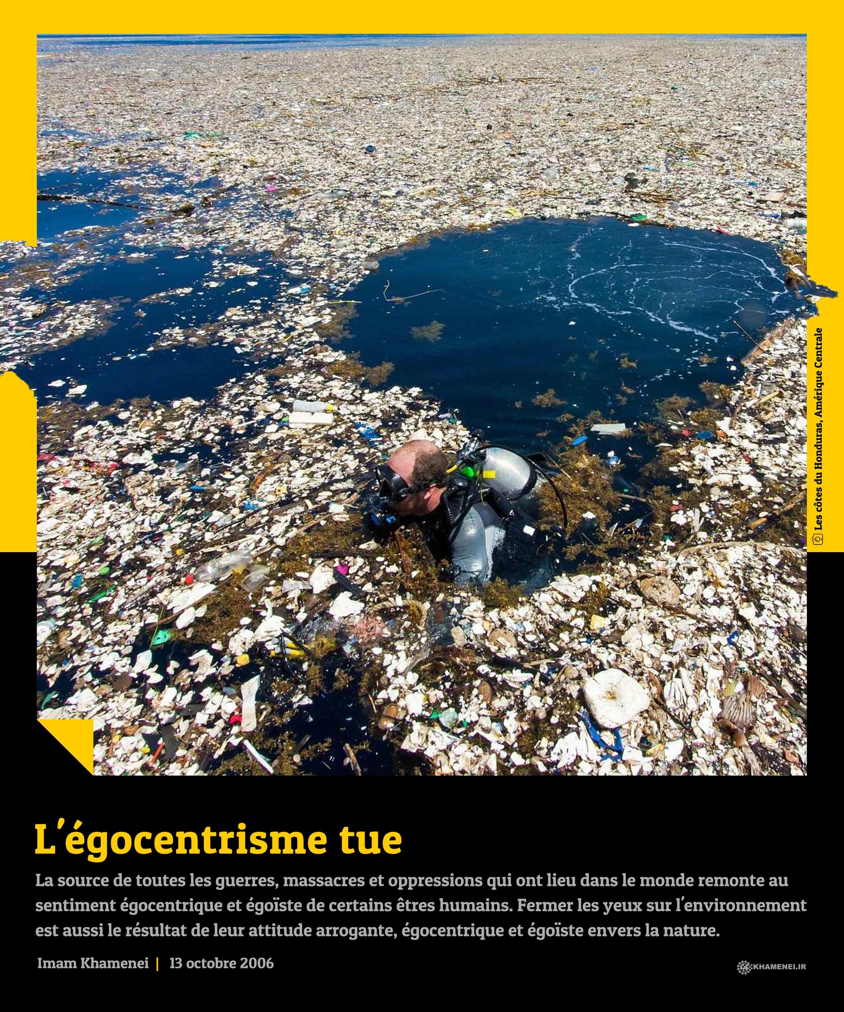 La source de toutes les guerres, massacres et oppressions qui ont lieu dans le monde remonte au sentiment égocentrique et égoïste de certains êtres humains. Fermer les yeux sur l'environnement est aussi le résultat de leur attitude arrogante, égocentrique et égoïste envers la nature. Imam Khamenei, 13 octobre 2006