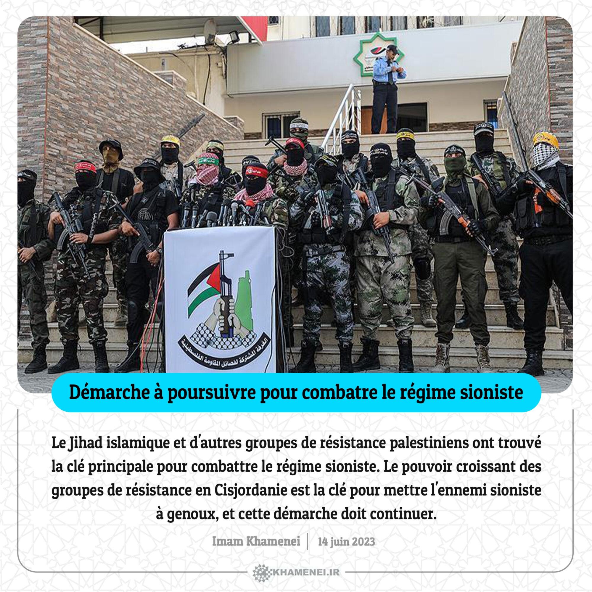 Le Jihad islamique et d'autres groupes de résistance palestiniens ont trouvé la clé principale pour combattre le régime sioniste. Le pouvoir croissant des groupes de résistance en Cisjordanie est la clé pour mettre l'ennemi sioniste à genoux, et cette démarche doit continuer. Imam Khamenei, 14 juin 2023
