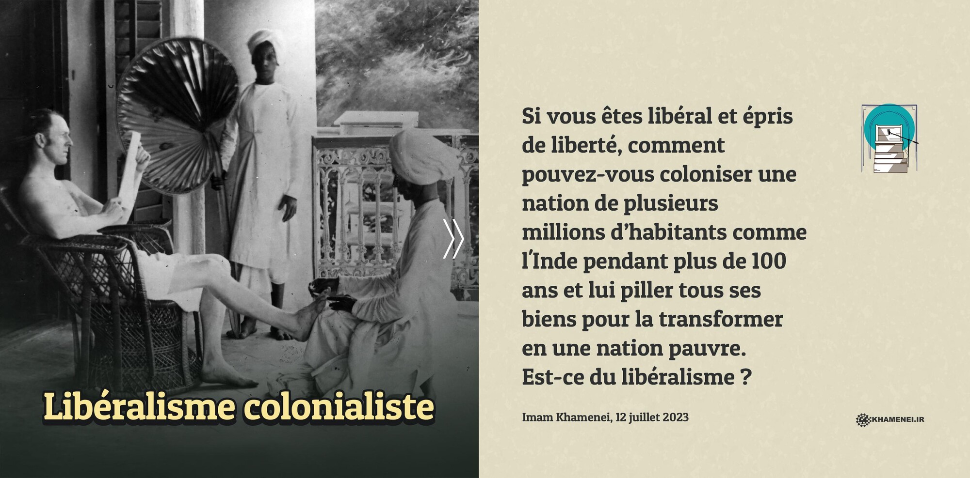 Si vous êtes libéral et épris de liberté, comment pouvez-vous coloniser une nation de plusieurs millions d’habitants comme l'Inde pendant plus de 100 ans et lui piller tous ses biens pour la transformer en une nation pauvre. Est-ce du libéralisme ? Imam Khamenei, 12 juillet 2023