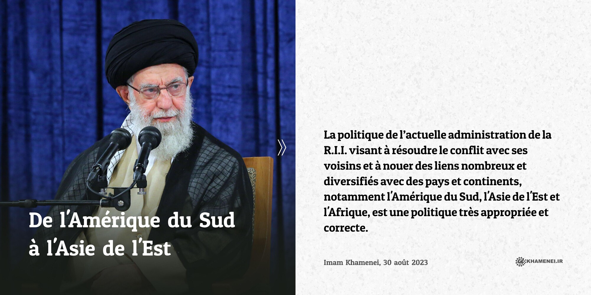 La politique de l’actuelle administration de la R.I.I. visant à résoudre le conflit avec ses voisins et à nouer des liens nombreux et diversifiés avec des pays et continents, notamment l'Amérique du Sud, l'Asie de l'Est et l'Afrique, est une politique très appropriée et correcte. Imam Khamenei, 30 août 2023
