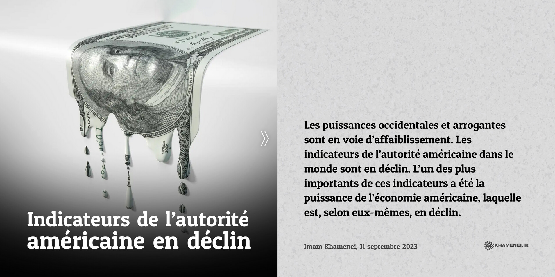 Les puissances occidentales et arrogantes sont en voie d’affaiblissement. Les indicateurs de l’autorité américaine dans le monde sont en déclin. L’un des plus importants de ces indicateurs a été la puissance de l’économie américaine, laquelle est, selon eux-mêmes, en déclin. Imam Khamenei, 11 septembre 2023