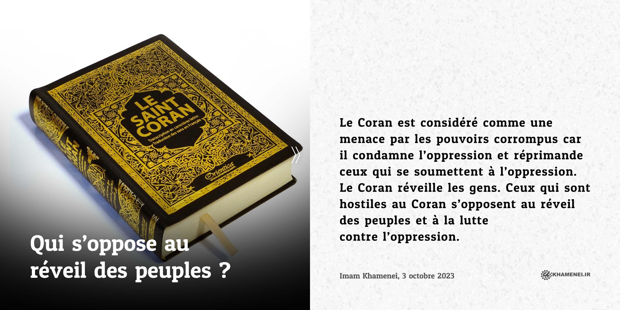 Le Coran est considéré comme une menace par les pouvoirs corrompus car il condamne l’oppression et réprimande ceux qui se soumettent à l’oppression. Le Coran réveille les gens. Ceux qui sont hostiles au Coran s’opposent au réveil des peuples et à la lutte contre l’oppression. Imam Khamenei, 3 octobre 2023