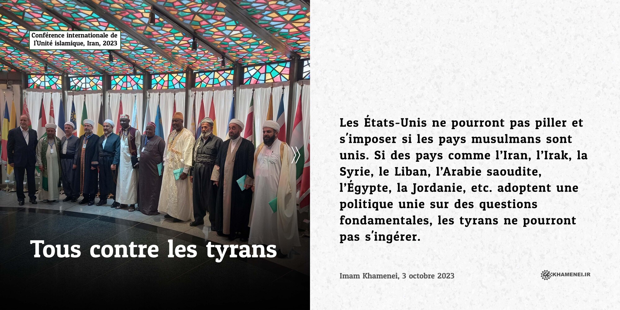Les États-Unis ne pourront pas piller et s'imposer si les pays musulmans sont unis. Si des pays comme l’Iran, l’Irak, la Syrie, le Liban, l’Arabie saoudite, l’Égypte, la Jordanie, etc. adoptent une politique unie sur des questions fondamentales, les tyrans ne pourront pas s'ingérer. Imam Khamenei, 3 octobre 2023
