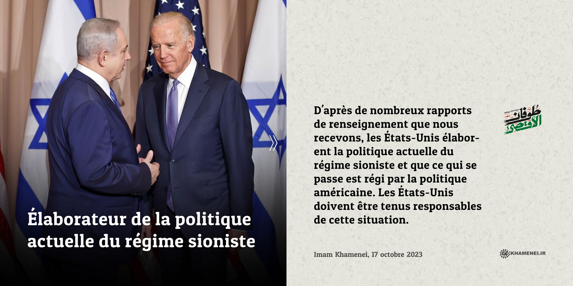 D'après de nombreux rapports de renseignement que nous recevons, les États-Unis élaborent la politique actuelle du régime sioniste et que ce qui se passe est régi par la politique américaine. Les États-Unis doivent être tenus responsables de cette situation. Imam Khamenei, 17 octobre 2023