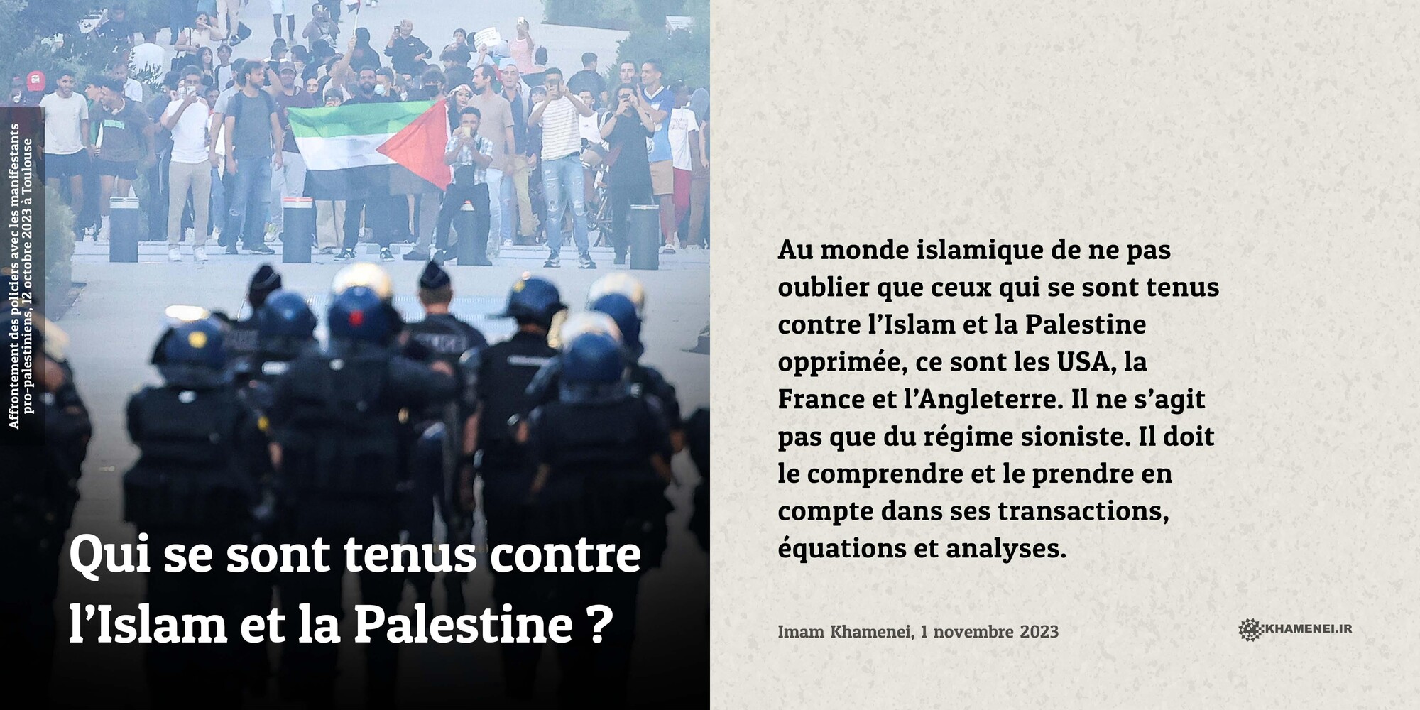 Au monde islamique de ne pas oublier que ceux qui se sont tenus contre l’Islam et la Palestine opprimée, ce sont les USA, la France et l’Angleterre. Il ne s’agit pas que du régime sioniste. Il doit le comprendre et le prendre en compte dans ses transactions, équations et analyses. Imam Khamenei, 1 novembre 2023