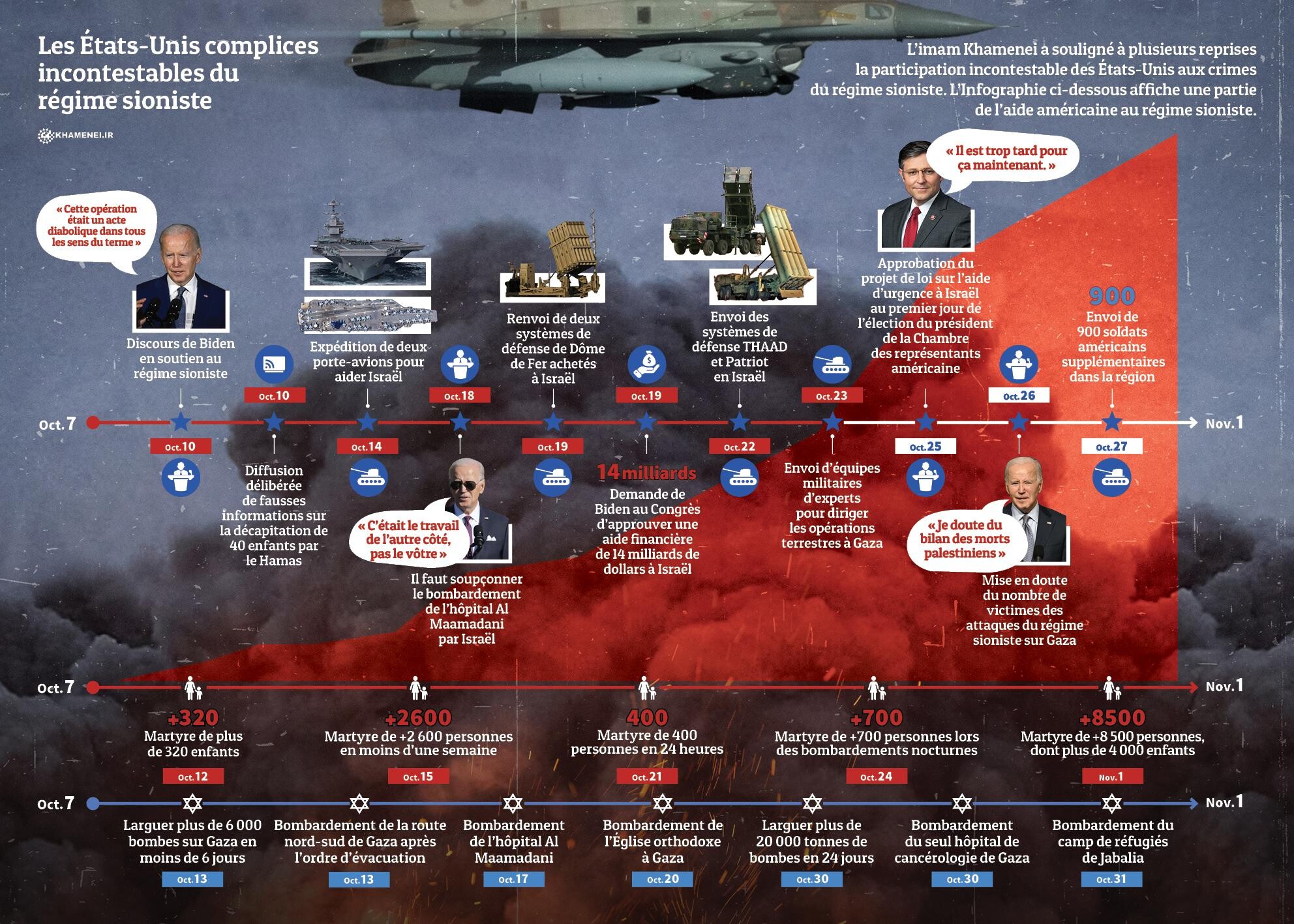 L’imam Khamenei a souligné à plusieurs reprises la participation incontestable des États-Unis aux crimes du régime sioniste. L’Infographie ci-dessous affiche une partie de l’aide américaine au régime sioniste.