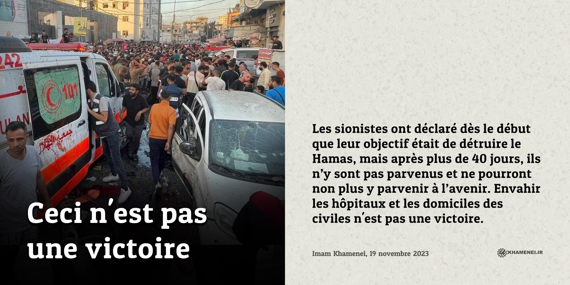 Les sionistes ont déclaré dès le début que leur objectif était de détruire le Hamas, mais après plus de 40 jours, ils n’y sont pas parvenus et ne pourront non plus y parvenir à l’avenir. Envahir les hôpitaux et les domiciles des civiles n'est pas une victoire. Imam Khamenei, 19 novembre 2023