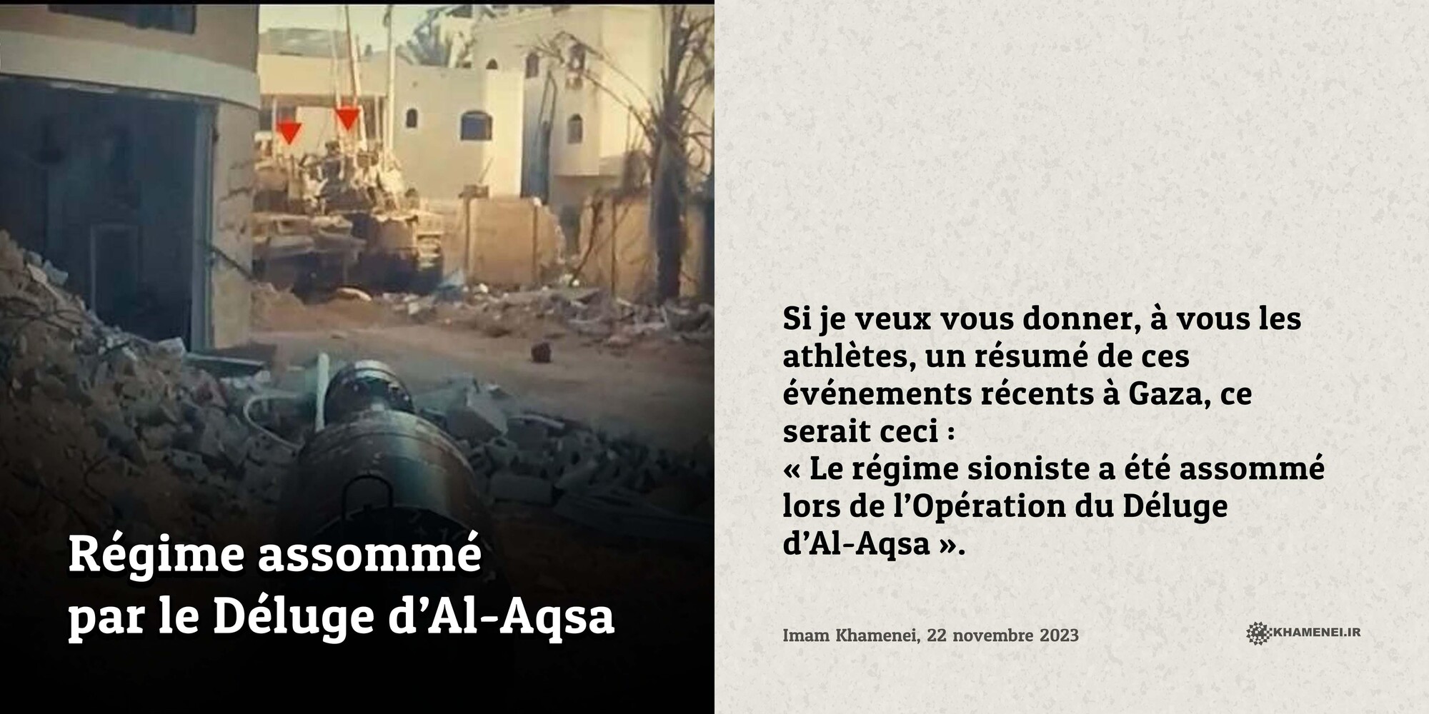 Si je veux vous donner, à vous les athlètes, un résumé de ces événements récents à Gaza, ce serait ceci : « Le régime sioniste a été assommé lors de l’Opération du Déluge d’Al-Aqsa ». Imam Khamenei, 22 novembre 2023