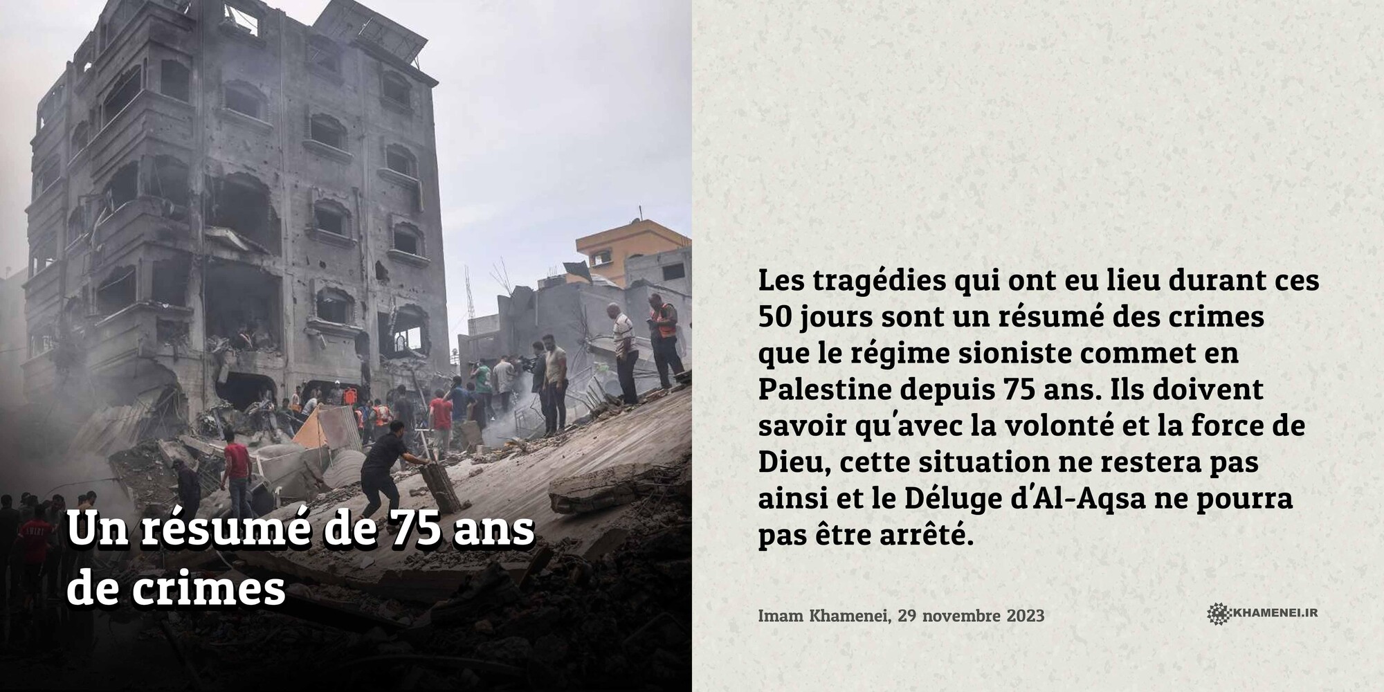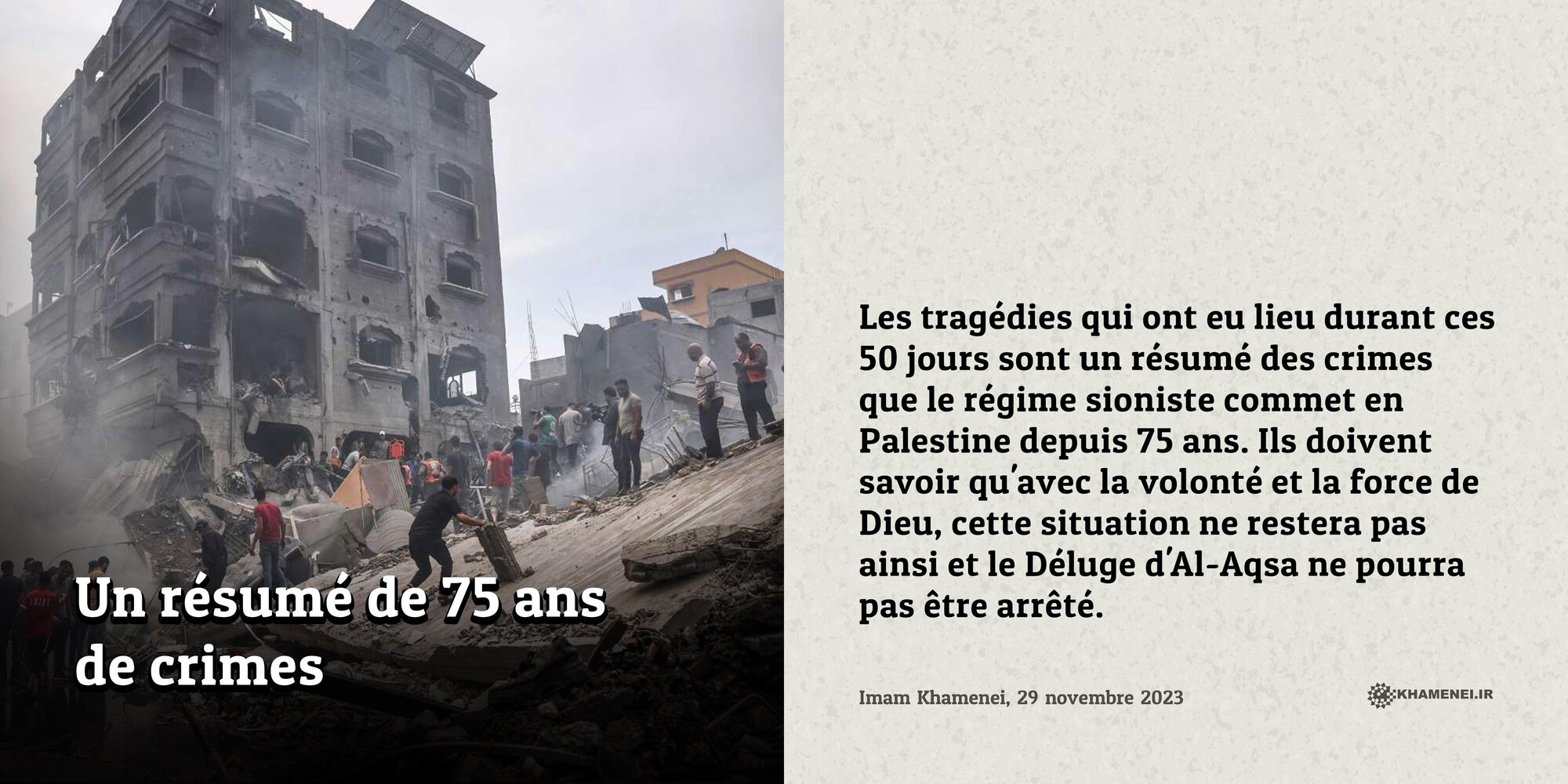 Les tragédies qui ont eu lieu durant ces 50 jours sont un résumé des crimes que le régime sioniste commet en Palestine depuis 75 ans. Ils doivent savoir qu'avec la volonté et la force de Dieu, cette situation ne restera pas ainsi et le Déluge d'Al-Aqsa ne pourra pas être arrêté. Imam Khamenei, 29 novembre 2023