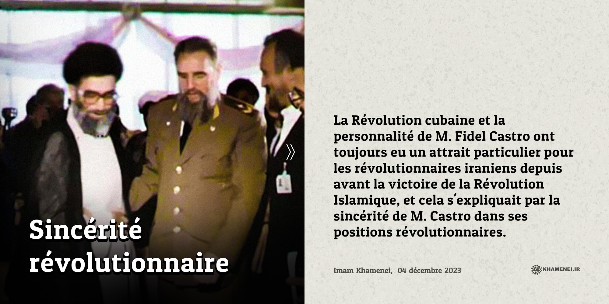 La Révolution cubaine et la personnalité de M. Fidel Castro ont toujours eu un attrait particulier pour les révolutionnaires iraniens depuis avant la victoire de la Révolution Islamique, et cela s'expliquait par la sincérité de M. Castro dans ses positions révolutionnaires. Ayatollah Khamenei, 04 décembre 2023