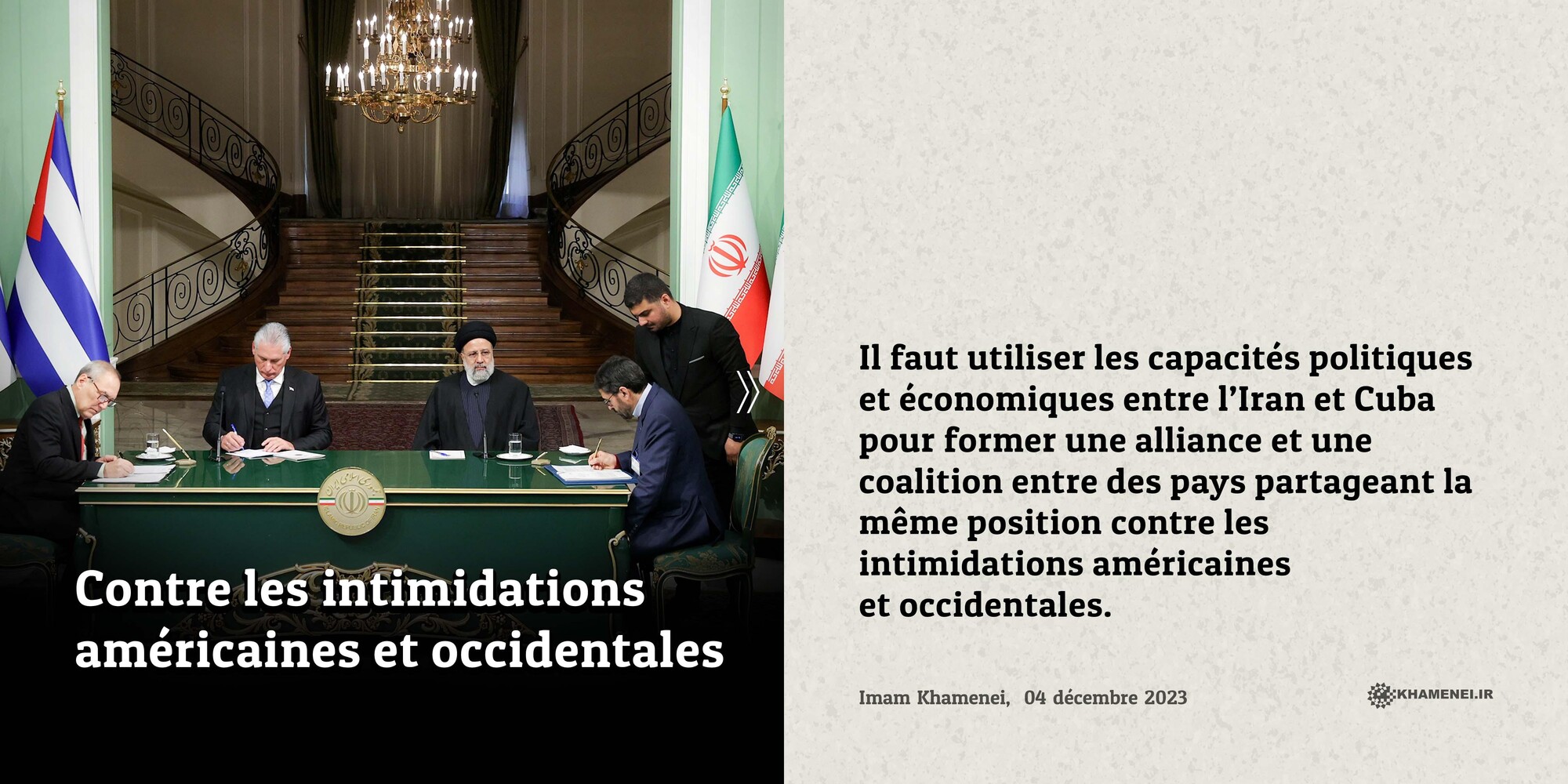 Il faut utiliser les capacités politiques et économiques entre l’Iran et Cuba pour former une alliance et une coalition entre des pays partageant la même position contre les intimidations américaines et occidentales. Ayatollah Khamenei, 04 décembre 2023