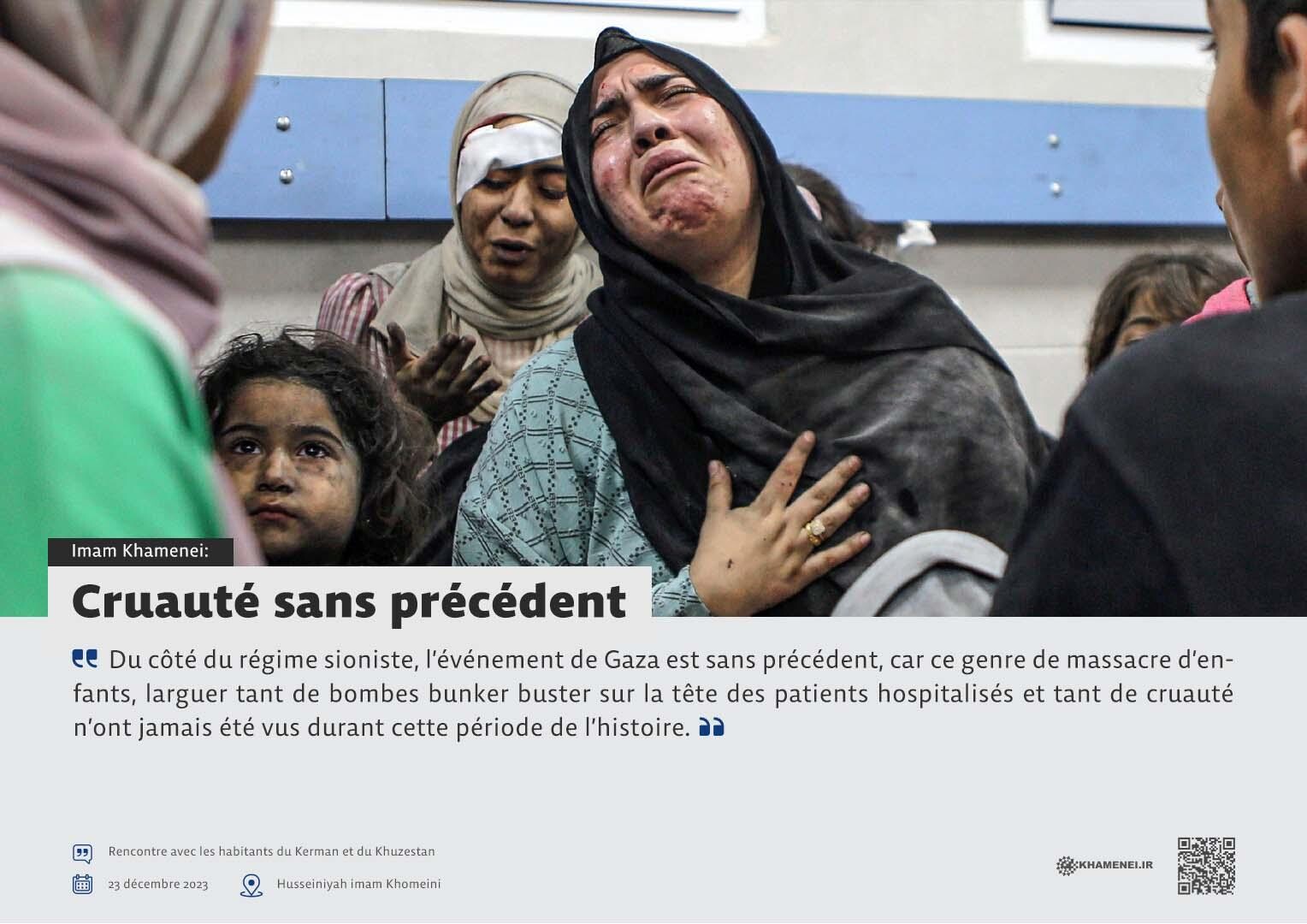 Du côté du régime sioniste, l’événement de Gaza est sans précédent, car ce genre de massacre d’enfants, larguer tant de bombes bunker buster sur la tête des patients hospitalisés et tant de cruauté n’ont jamais été vus durant cette période de l’histoire. Imam Khamenei, 23 décembre 2023