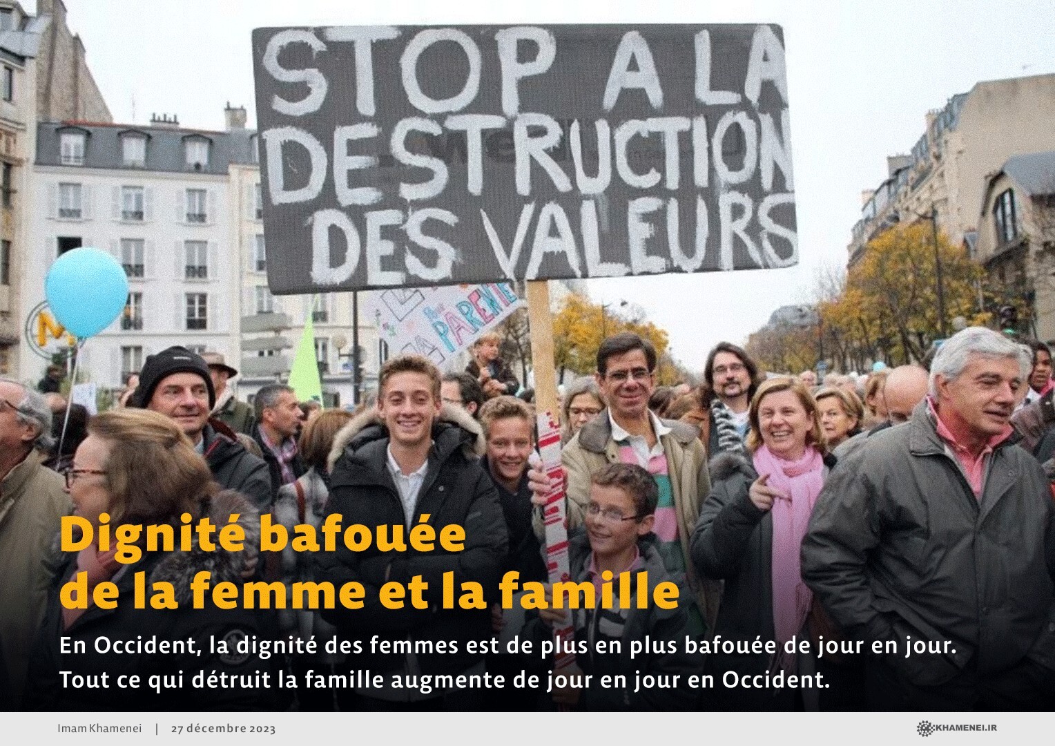 En Occident, la dignité des femmes est de plus en plus bafouée de jour en jour. Tout ce qui détruit la famille augmente de jour en jour en Occident. Imam Khamenei, 27 décembre 2023