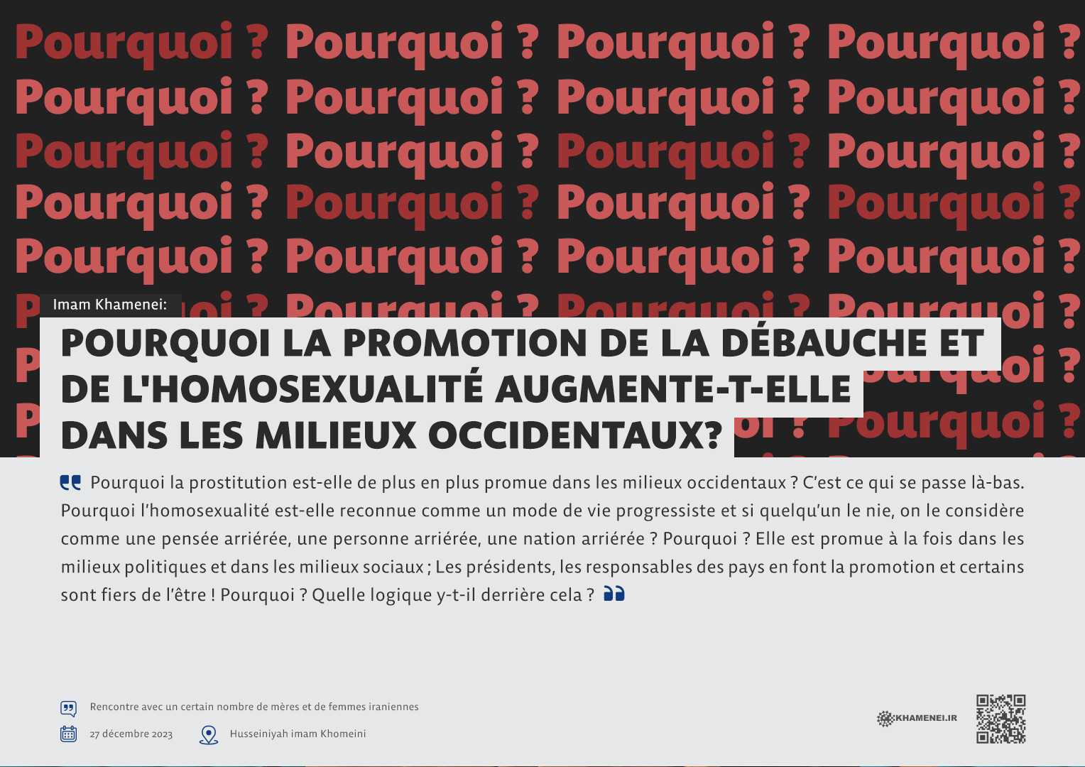 Pourquoi la prostitution est-elle de plus en plus promue dans les milieux occidentaux ? C’est ce qui se passe là-bas. Pourquoi l’homosexualité est-elle reconnue comme un mode de vie progressiste et si quelqu’un le nie, on le considère comme une pensée arriérée, une personne arriérée, une nation arriérée ? Pourquoi ? Elle est promue à la fois dans les milieux politiques et dans les milieux sociaux ; Les présidents, les responsables des pays en font la promotion et certains sont fiers de l’être ! Pourquoi ? Quelle logique y-t-il derrière cela ? Imam Khamenei, 27 décembre 2023