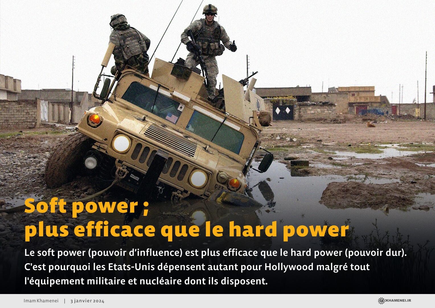 Le soft power (pouvoir d’influence) est plus efficace que le hard power (pouvoir dur). C'est pourquoi les Etats-Unis dépensent autant pour Hollywood malgré tout l'équipement militaire et nucléaire dont ils diposent. Imam Khamenei, 3 janvier 2024