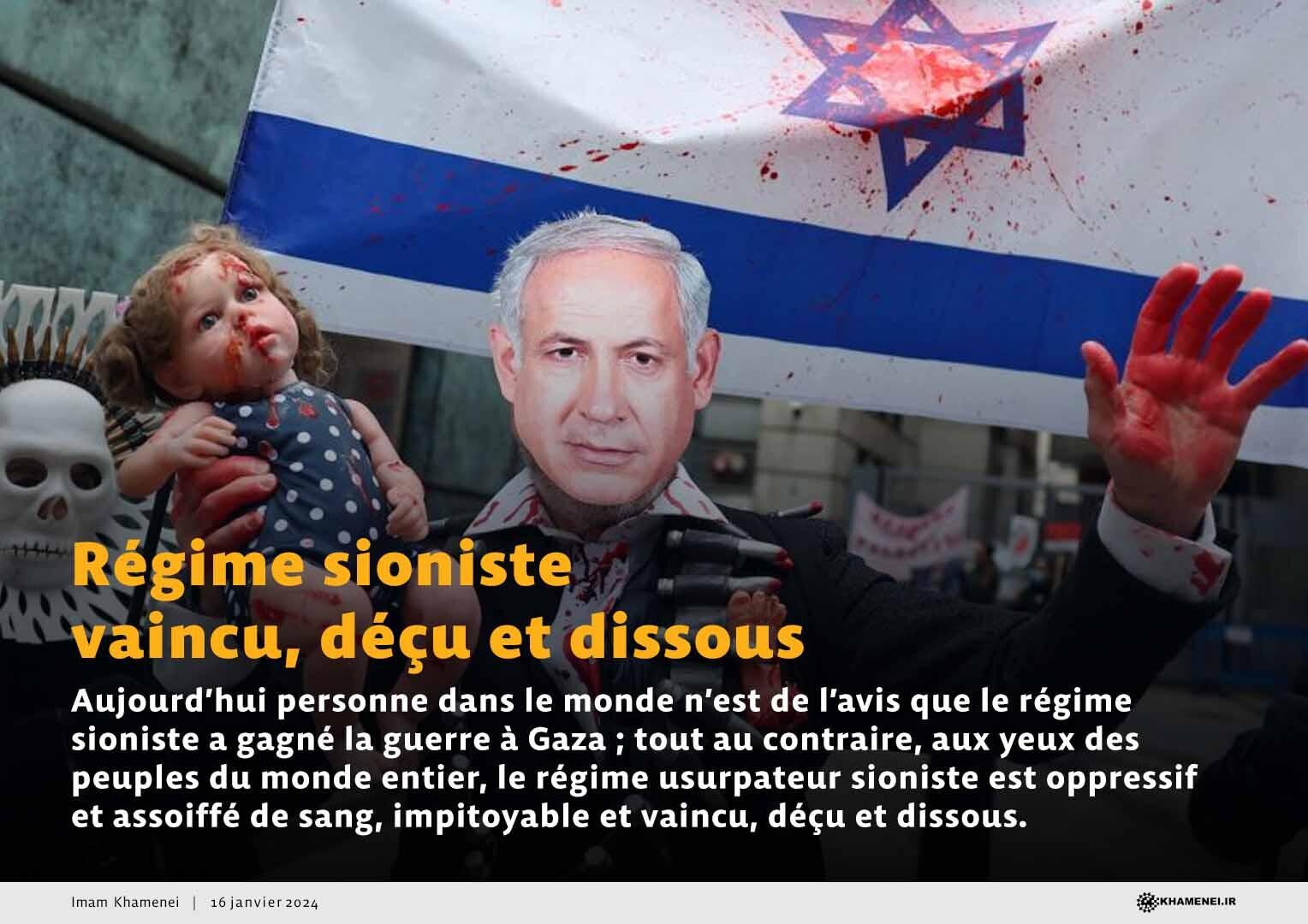 Aujourd’hui personne dans le monde n’est de l’avis que le régime sioniste a gagné la guerre à Gaza ; tout au contraire, aux yeux des peuples du monde entier, le régime usurpateur sioniste est oppressif et assoiffé de sang, impitoyable et vaincu, déçu et dissous. Imam Khamenei, 16 janvier 2024