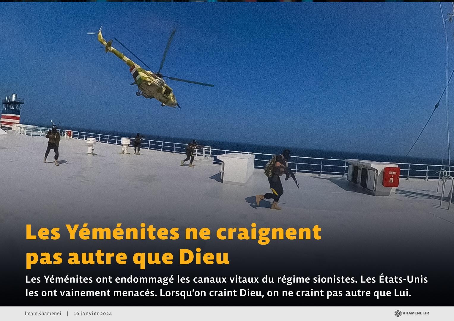 Les Yéménites ont endommagé les canaux vitaux du régime sionistes. Les États-Unis les ont vainement menacés. Lorsqu’on craint Dieu, on ne craint pas autre que Lui. Imam Khamenei, 16 janvier 2024