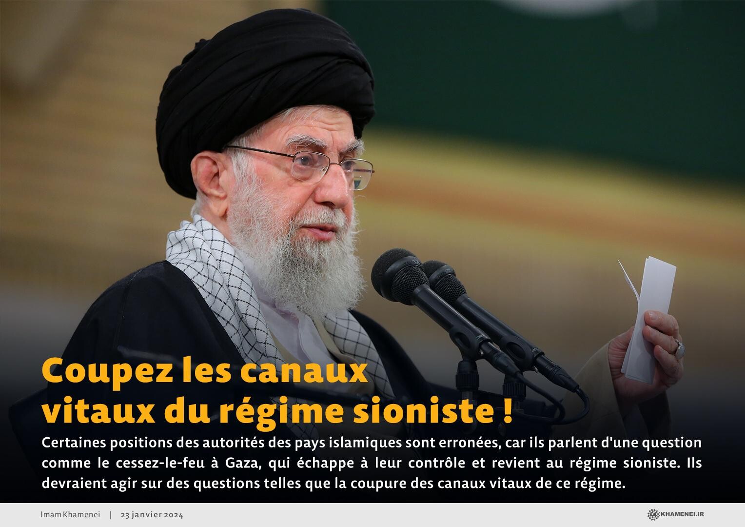 Certaines positions des autorités des pays islamiques sont erronées, car ils parlent d'une question comme le cessez-le-feu à Gaza, qui échappe à leur contrôle et revient au régime sioniste. Ils devraient agir sur des questions telles que la coupure des canaux vitaux de ce régime. Imam Khamenei, 23 janvier 2024