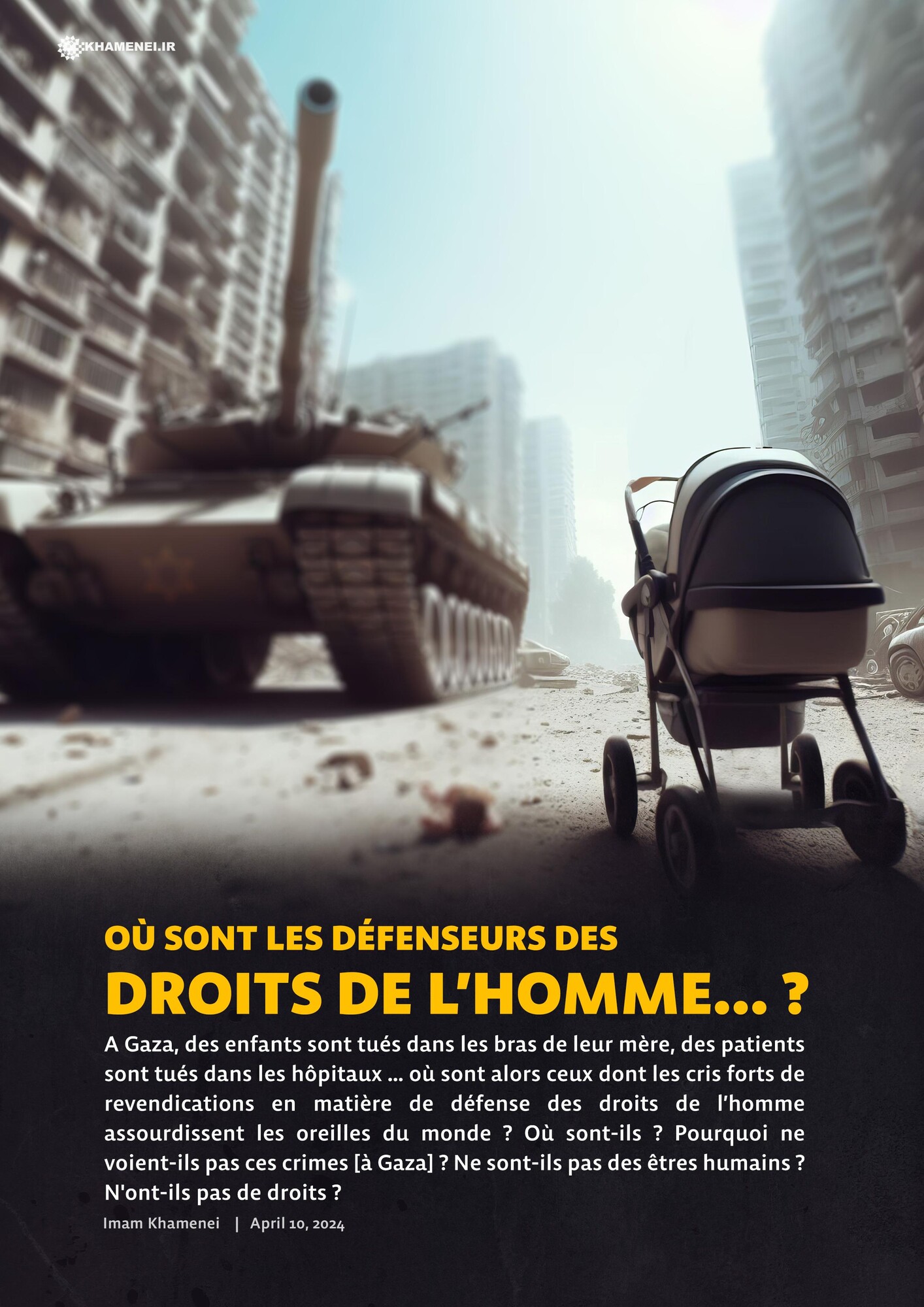 A Gaza, des enfants sont tués dans les bras de leur mère, des patients sont tués dans les hôpitaux ... où sont alors ceux dont les cris forts de revendications en matière de défense des droits de l’homme assourdissent les oreilles du monde ? Où sont-ils ? Pourquoi ne voient-ils pas ces crimes [à Gaza] ? Ne sont-ils pas des êtres humains ? N'ont-ils pas de droits ? Imam Khamenei 10 avril 2024