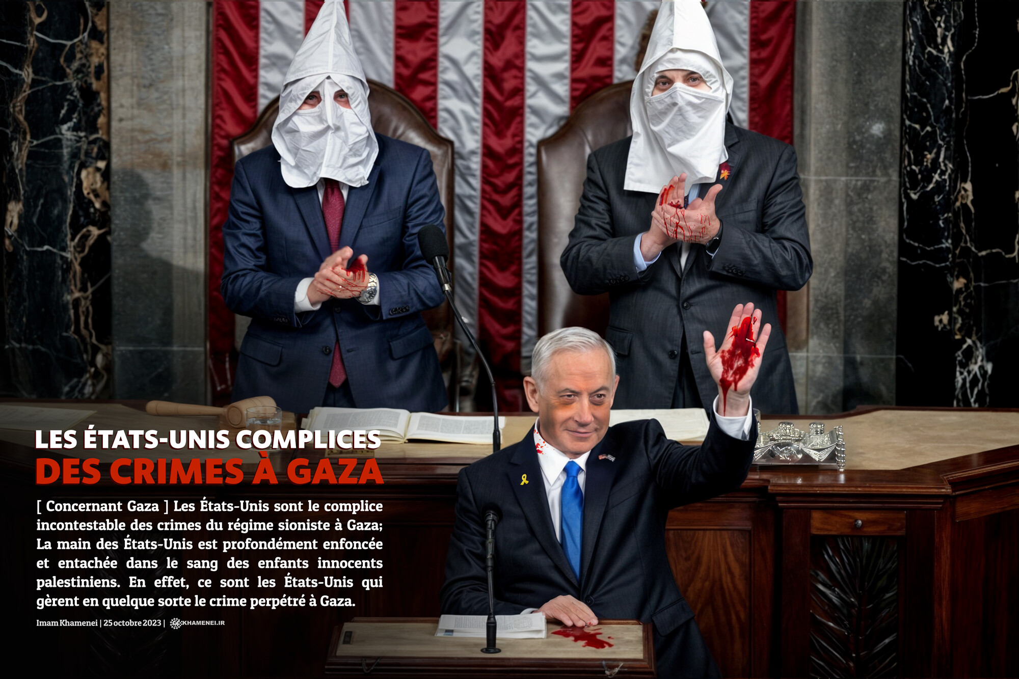 [ Concernant Gaza ] Les États-Unis sont le complice incontestable des crimes du régime sioniste à Gaza; La main des États-Unis est profondément enfoncée et entachée dans le sang des enfants innocents palestiniens. En effet, ce sont les États-Unis qui gèrent en quelque sorte le crime perpétré à Gaza. Imam Khamenei, 25 octobre 2023