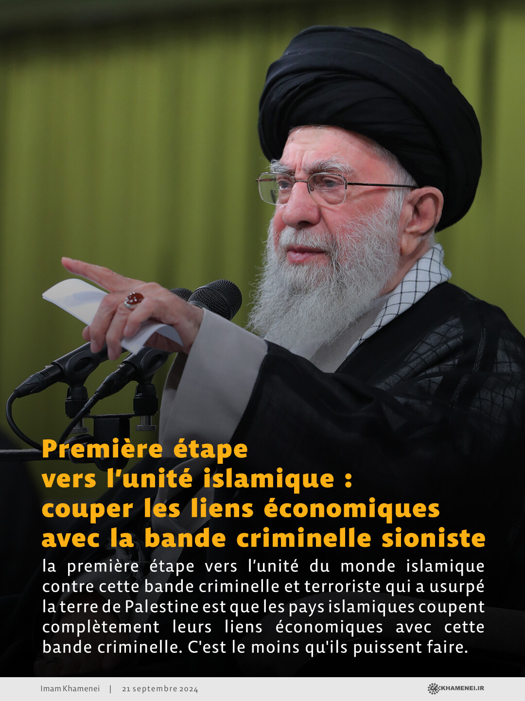 la première étape vers l’unité du monde islamique contre cette bande criminelle et terroriste qui a usurpé la terre de Palestine est que les pays islamiques coupent complètement leurs liens économiques avec cette bande criminelle. C'est le moins qu'ils puissent faire. Imam Khamenei, 21 septembre 2024