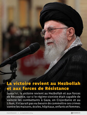 Jusqu’ici, la victoire revient au Hezbollah et aux forces de Résistance, car si le régime sioniste était capable de vaincre les combattants à Gaza, en Cisjordanie et au Liban, il n’aurait pas eu besoin de commettre ces crimes contre les maisons, écoles, hôpitaux, enfants et femmes. Imam Khamenei, 25 septembre 2024
