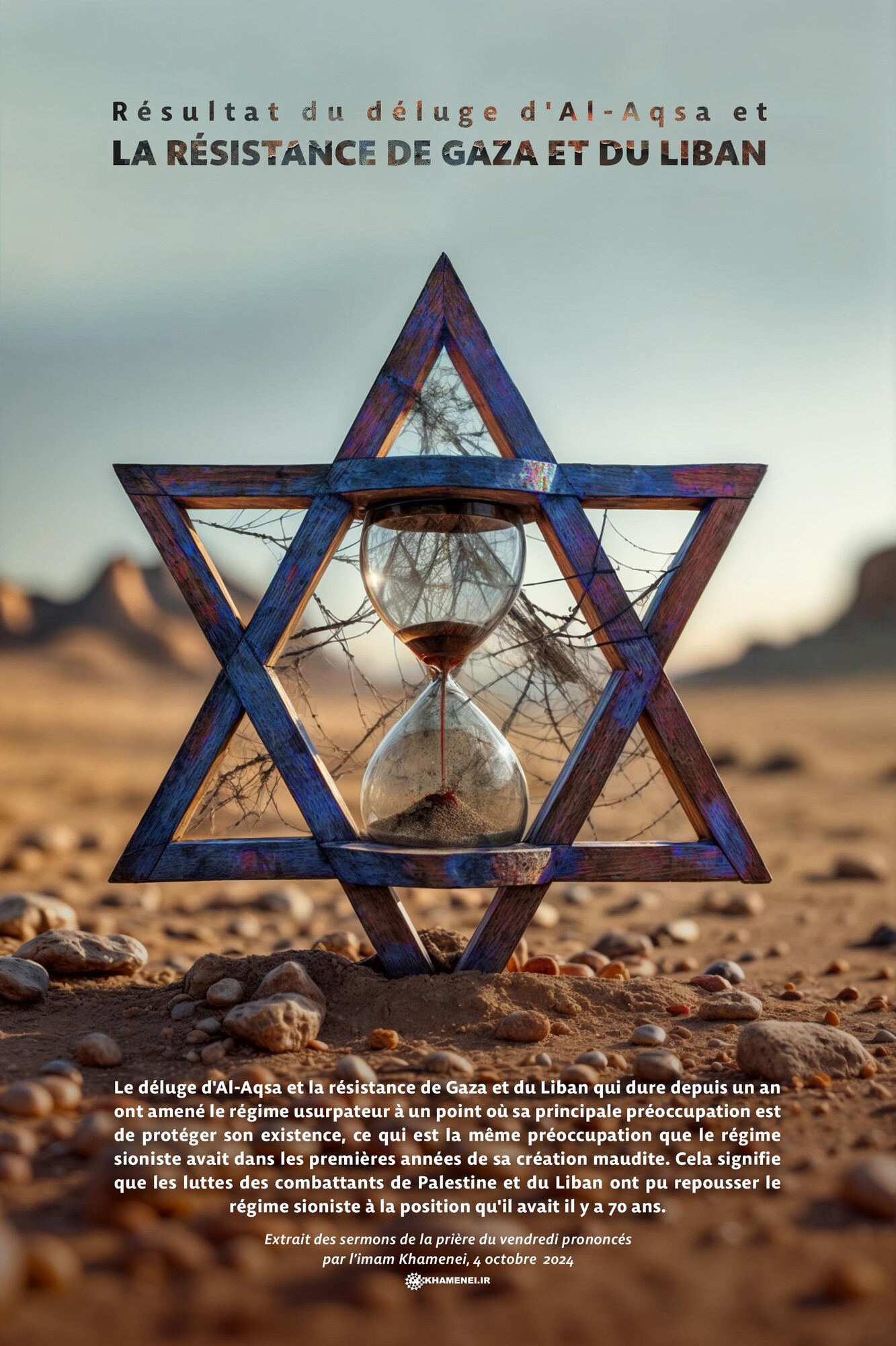 Le déluge d'Al-Aqsa et la résistance de Gaza et du Liban qui dure depuis un an ont amené le régime usurpateur à un point où sa principale préoccupation est de protéger son existence, ce qui est la même préoccupation que le régime sioniste avait dans les premières années de sa création maudite. Cela signifie que les luttes des combattants de Palestine et du Liban ont pu repousser le régime sioniste à la position qu'il avait il y a 70 ans. Extrait des sermons de la prière du vendredi prononcés par l’imam Khamenei, 4 octobre 2024
