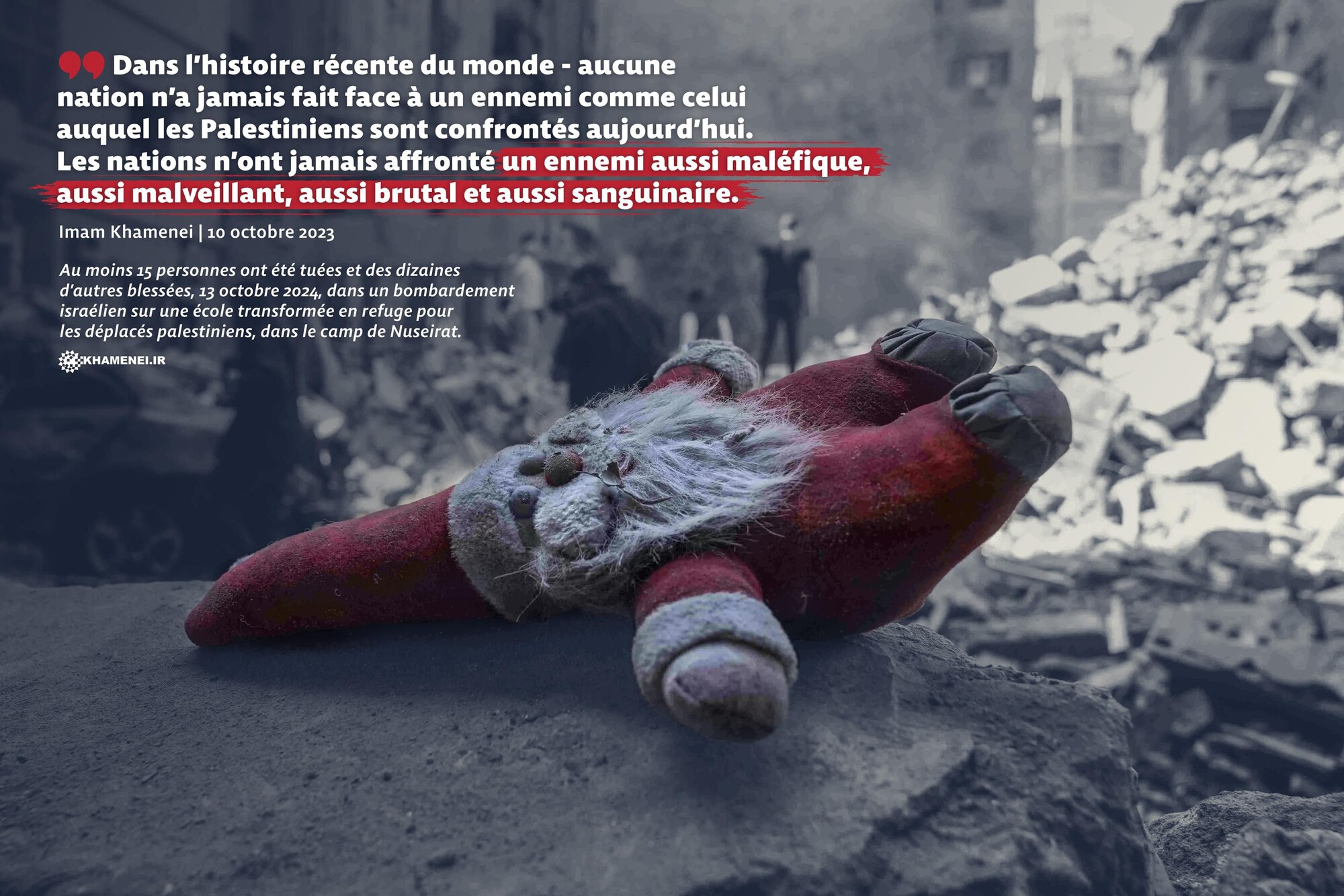 Dans l’histoire récente du monde - aucune nation n’a jamais fait face à un ennemi comme celui auquel les Palestiniens sont confrontés aujourd’hui. Les nations n’ont jamais affronté un ennemi aussi maléfique, aussi malveillant, aussi brutal et aussi sanguinaire. Imam Khamenei, 10 octobre 2023