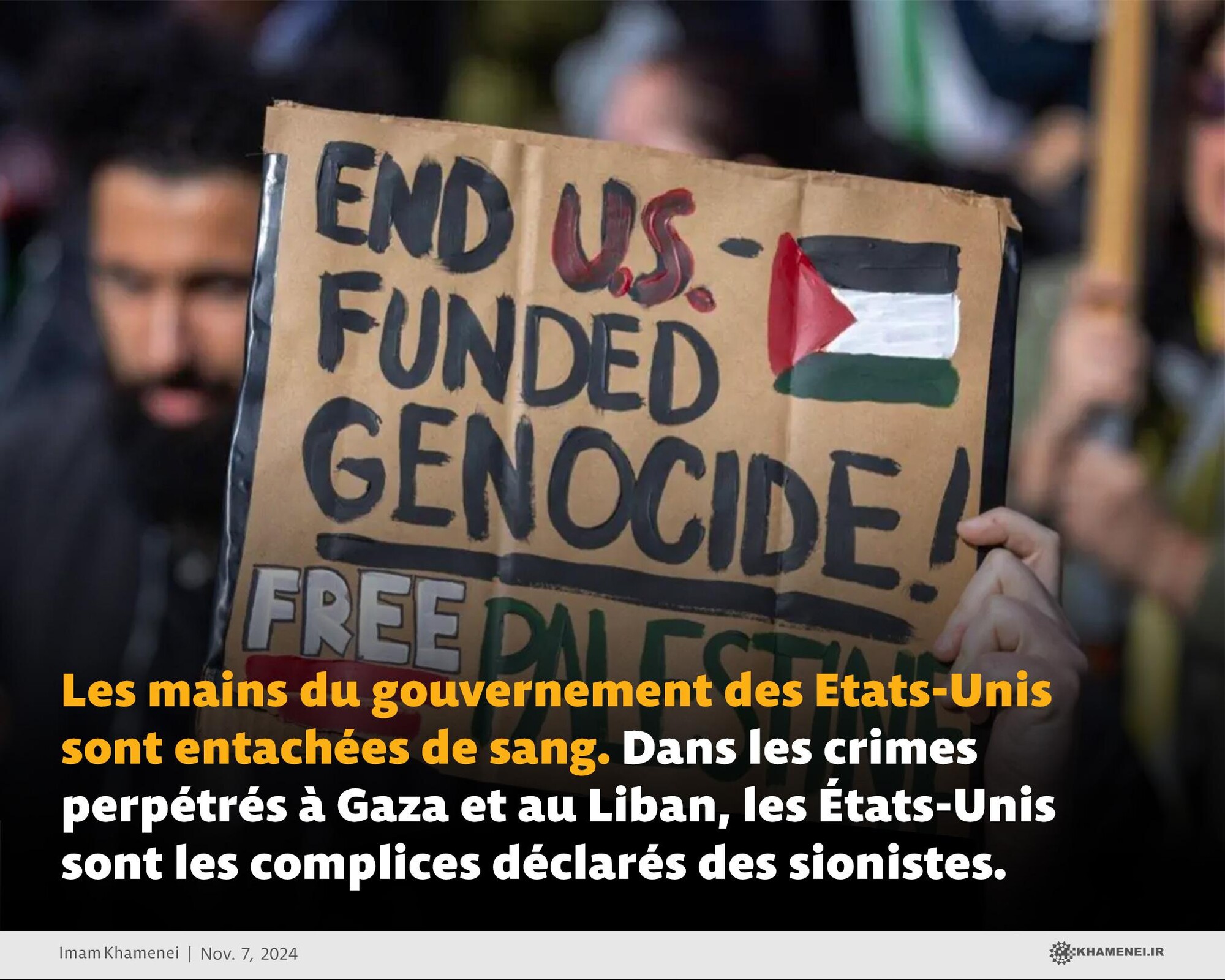 Les mains du gouvernement des Etats-Unis sont entachées de sang. Dans les crimes perpétrés à Gaza et au Liban, les États-Unis sont les complices déclarés des sionistes. Imam Khamenei, 7 novembre 2024.