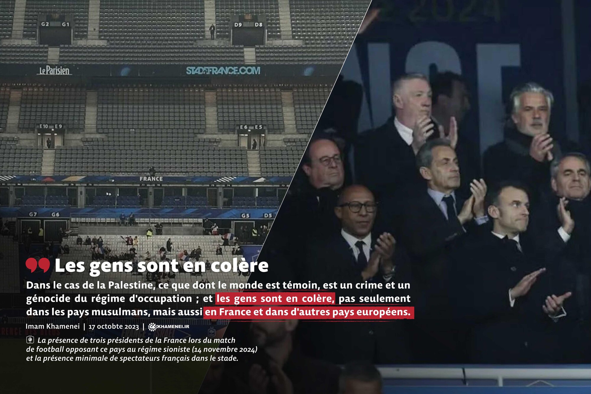 Dans le cas de la Palestine, ce que dont le monde est témoin, est un crime et un génocide du régime d'occupation ; et les gens sont en colère, pas seulement dans les pays musulmans, mais aussi en France et dans d'autres pays européens. Imam Khamenei 17 octobte 2023 - (La présence de trois présidents de la France lors du match de football opposant ce pays au régime sioniste (14 novembre 2024) et la présence minimale de spectateurs français dans le stade).